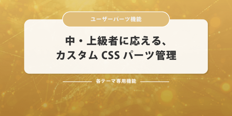 1. プリセットを超えて、自分だけのデザインを GOLDテーマには、見出し・ボタン・ボックスなど600種類以上のプリセットデザインが標準搭載されています。しかし、もっと自分らしいデザインにしたい方のために、「ユーザーパーツ」機能を用意しました。 この機能を使えば、見出しやボタン、テーブル、ブログカードなどあらゆる装飾パーツに対して、自分だけのスタイルをCSS...