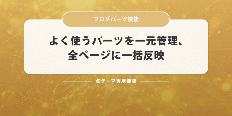 1. CTAや定型エリアを、いつでも再利用 GOLDテーマでは、サイト運営で頻出する「使い回すパーツ」を効率的に管理できるブログパーツ機能を搭載しています。専用のカスタム投稿タイプで作成し、ブロックエディタ上でレイアウトも自由自在。たとえば、以下のような場面で大活躍します。 記事下に毎回掲載する「お問い合わせ」や「資料請求」のCTAエリア セール告知・キャン...