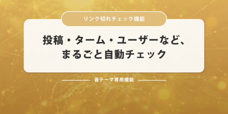 1. サイト全体のリンク切れを一括検出!手動チェックの時代は終わり GOLDテーマでは、投稿・カスタム投稿・ターム(カテゴリ・タグなど)・ユーザー・カスタマイザー・ウィジェットまで、あらゆる場所に埋め込まれたリンクや画像のURLを自動で巡回し、HTTPステータスでチェック。404や403などのエラーがあれば、自動で記録・一覧化されます。 aタグやimgタグ内...